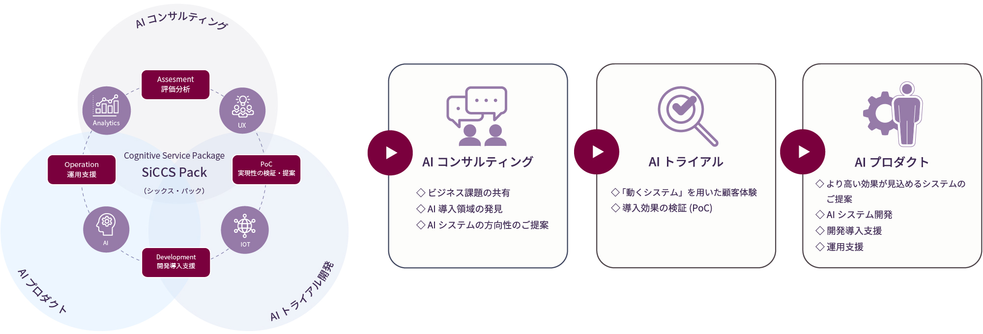 当社のAIサービスパッケージ「SiCCS Pack」は3つのAIメニューでお客様の課題解決に寄与いたします。